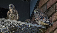 Turmfalken brauchen nicht unbedingt einen Turm um zu brüten. Ein hoher Standort des Nistkastens, an einem Einfamilienhaus, reicht oft schon aus. Diese jungen Falken üben zwar noch das Fliegen, doch…