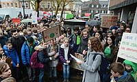 Schüler verlasen bei der Demonstration auf dem Kempener Buttermarkt Botschaften – unter anderem einen offenen Brief an Bundeskanzlerin Angela Merkel. Foto: Wolfgang Kaiser „Wir sind hier, wir sind…